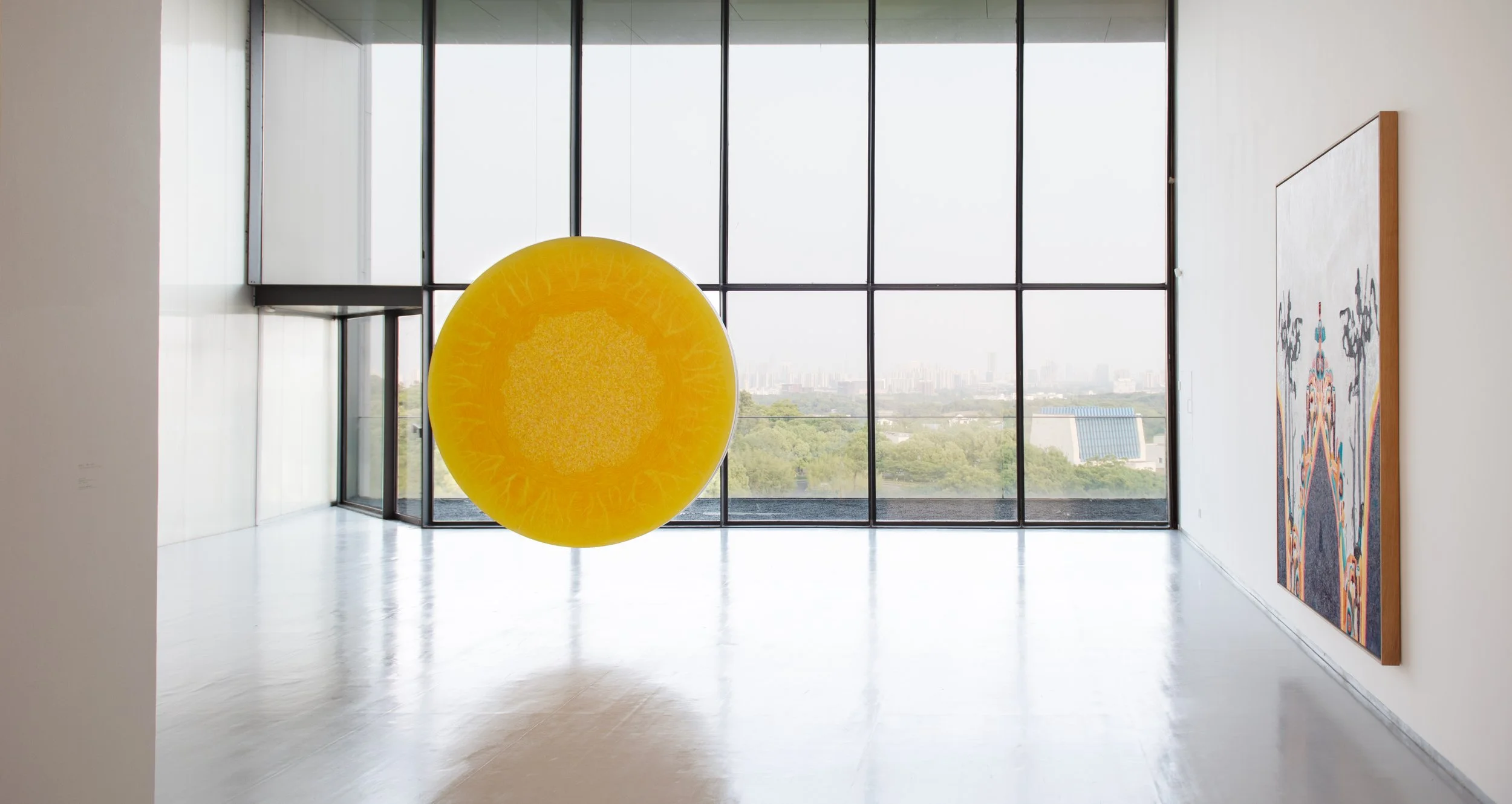 William Monk is known for his enigmatic paintings that break down figuration. Viewers are drawn into a fictive realm by his works where the artist keeps realizing signals connecting imagery and “significance”, while repeating certain elements to subtly construct his own symbolic spectrum. However, he always halts at a moment when the viewer is poised to establish meaningful connections between the paintings and reality. I and II of the Smoke Ring Mountain series, exhibited in the first-floor main gallery, are bathed in an ambiguous light pink hue, while III and IV are overcast with a somber gradient crimson where danger looms. Their communicating through smoke signals, hard to transcribe in the fog. In the museum’s staircase space, Son (return) I and Nova (deadeye) III—circular paintings created between 2021 and 2022 —hover midair like a space tunnel caught in motion. The former exudes a sacred and ever-dispersing yellow that resonates with the religious undertones of its title.